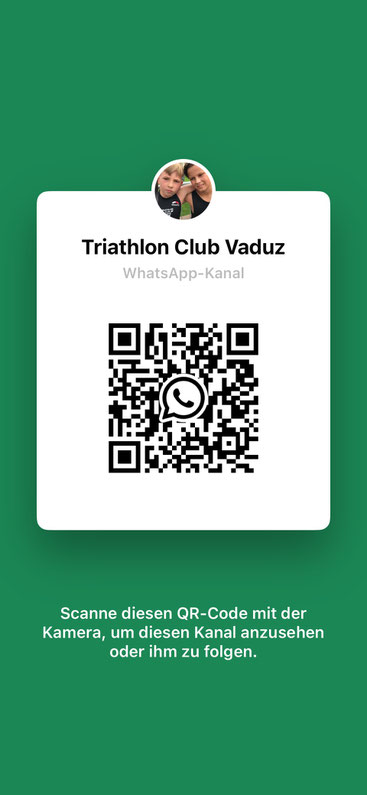 Scanne den QR Code und abonniere den WhatsApp Kanal des Triathlon Club Vaduz. Hier posten wir die aktuellen Informationen zum Club.
